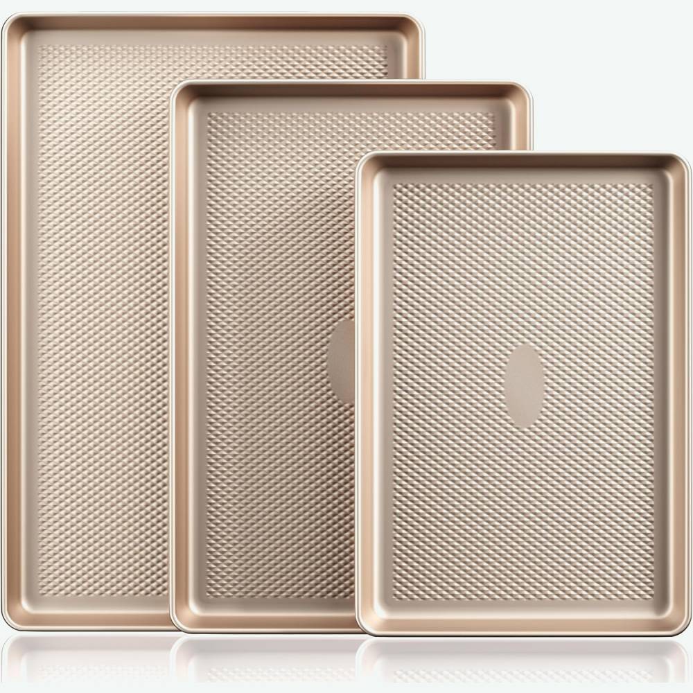 This baking pan set includes three nonstick cookie sheets (13”x9”, 15”x10”, and 17.5”x12”). The small pan is perfect for baking cookies, pastries, and lasagna, the medium size for jelly rolls, and the large size for chicken and vegetables. This versatile set easily meets your daily baking needs, helping you elevate your baking skills.