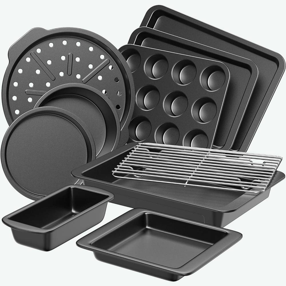 The complete 10-piece baking set offers a well-thought-out and practical selection, including a roasting pan (15×10.2×2.3 in), a half sheet pan (17x12x1 in), a jelly roll pan (15x10x1 in), a cooling rack, a standard-size muffin pan (14.6×9.8×1.2 in), a loaf pan (9.8×4.5×2.2 in), a pizza pan (14×1 in), a square cake pan (8x8x2 in), a deep cake pan (8x8x2.5 in), and a shallow cake pan (8x8x1.3 in).